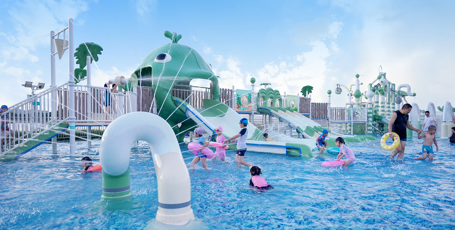 項目簡介:珠海熱浪灣水樂園設(shè)計面積:1551㎡,產(chǎn)品采用溫和而有張力的莫蘭迪色系,結(jié)構(gòu)新穎,組合獨特,讓空間變得更加高級雅致。適合親子家庭一起游玩。主要產(chǎn)品有鯨魚戲水水屋、各種趣味戲水小品:水簾門、麻花戲水、漏斗戲水、倒水桶、水槍、形形色色的動物植物造型戲水小品等。在百變的噴水造型中,孩子們可觀察到各種各樣噴水的特性,在玩樂中了解自然,潛移默化地提高孩子們的創(chuàng)造力及想象力。在一個零腐蝕、安全的水上游樂場盡情地游玩、健康地成長,這也正是家長們所期盼的。