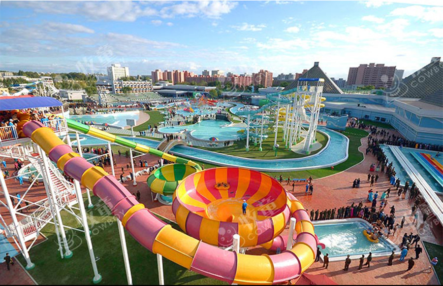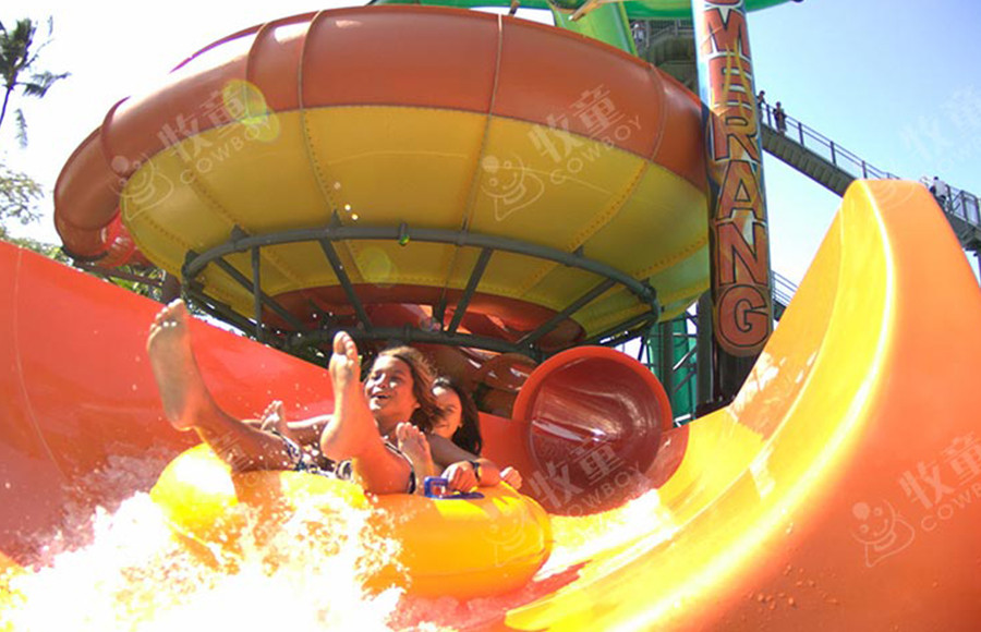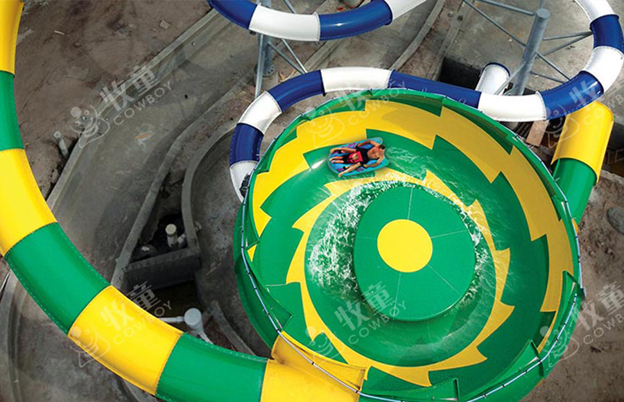 巨獸碗滑梯又稱旋渦滑梯,游客乘坐雙人皮筏,從高10米多的平臺口滑下,通過了一段長達幾十米
