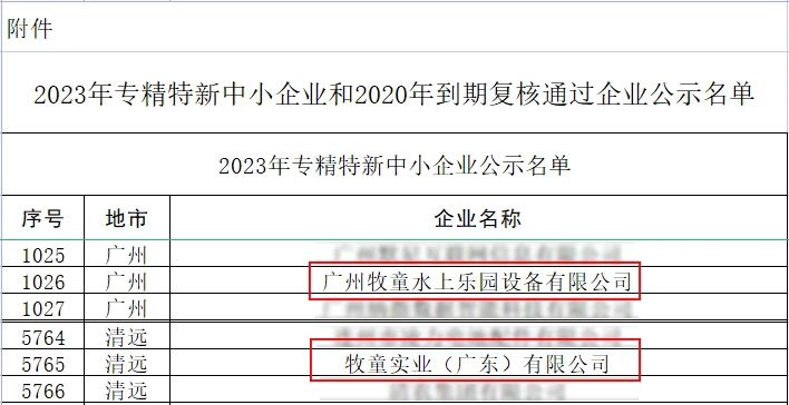 近日,牧童集團旗下子公司又傳捷報:2023年12月12日,廣東省工業(yè)和信息化廳發(fā)布《關于2023年專精特新中小企業(yè)和2020年到期復核通過企業(yè)名單的公示》,牧童集團旗下牧童實業(yè)(廣東)有限公司、廣州牧童水上樂園設備有限公司兩家子公司獲得了廣東省“2023年專精特新中小企業(yè)”認證!